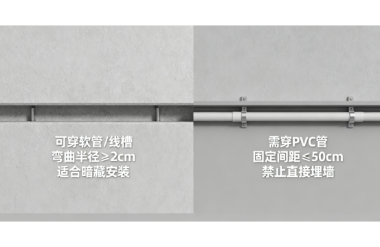 導(dǎo)線選型:低壓燈帶用RVV2×0.75mm2軟線(銅芯截面積≥0.5mm2),高壓燈帶需匹配BVV2×1.5mm2硬線(承載電流≥10A),避免用家裝常用的1.0mm2線導(dǎo)致發(fā)熱。